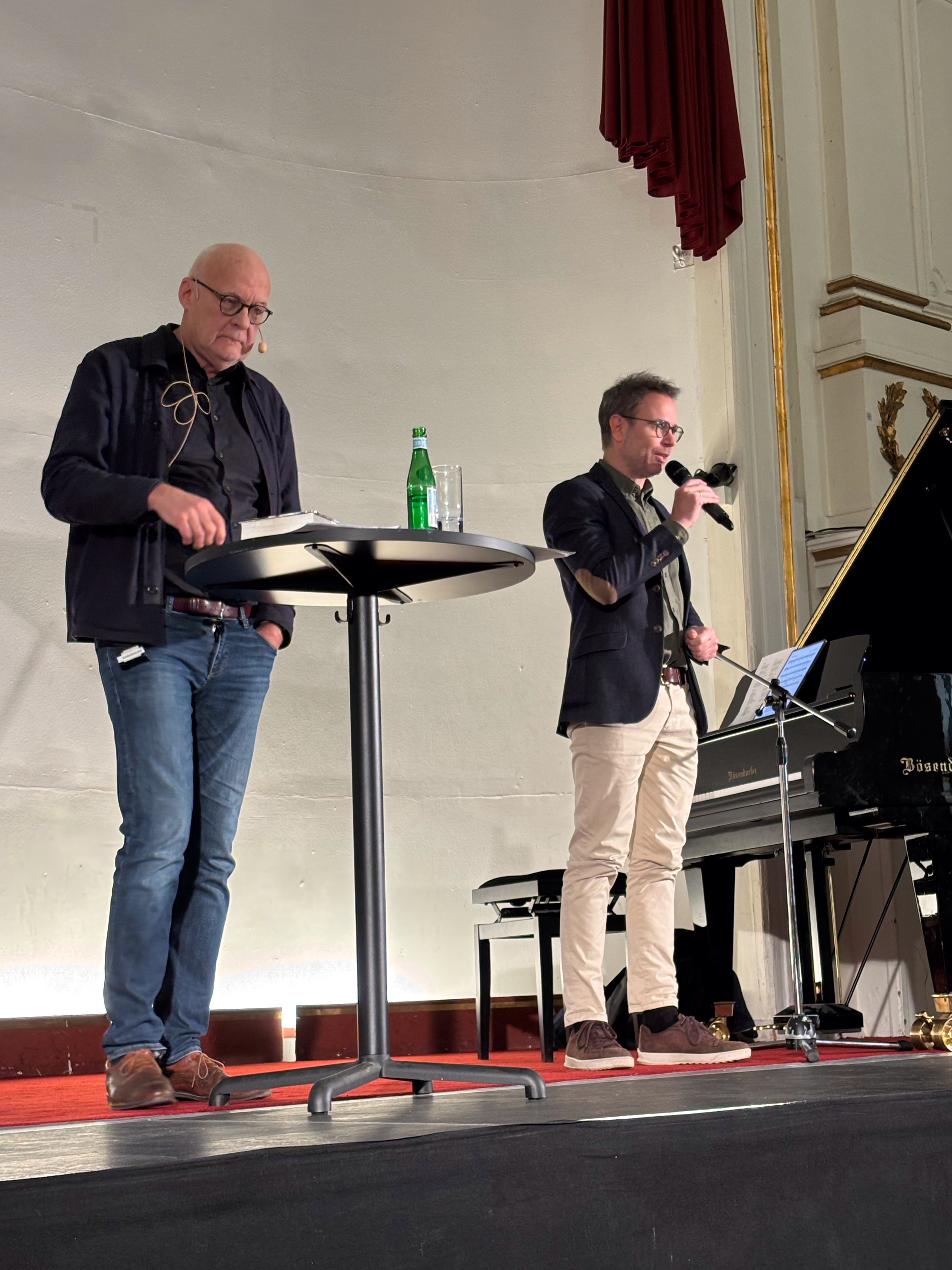 Forfatteren Erik Lindsø og hans pianist, underholder om Benny Andersen